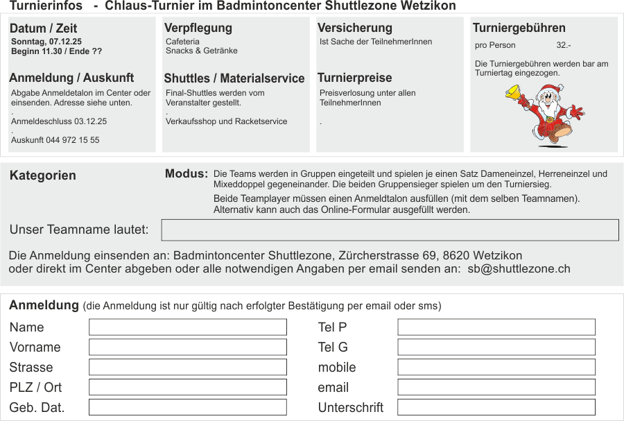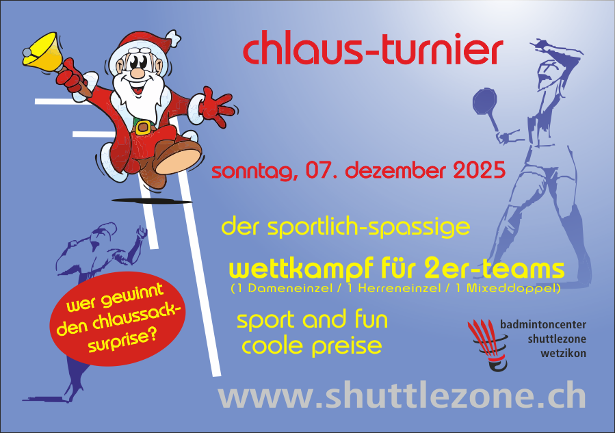 noch vor den fest- und feiertagen mit der familie, den freunden, den nachbarn auf dem badmintonfeld spass haben und tolle ballwechsel erleben – und am 7. chlaus turnier in wetzikon als team an einem plauschturnier teilnehmen.